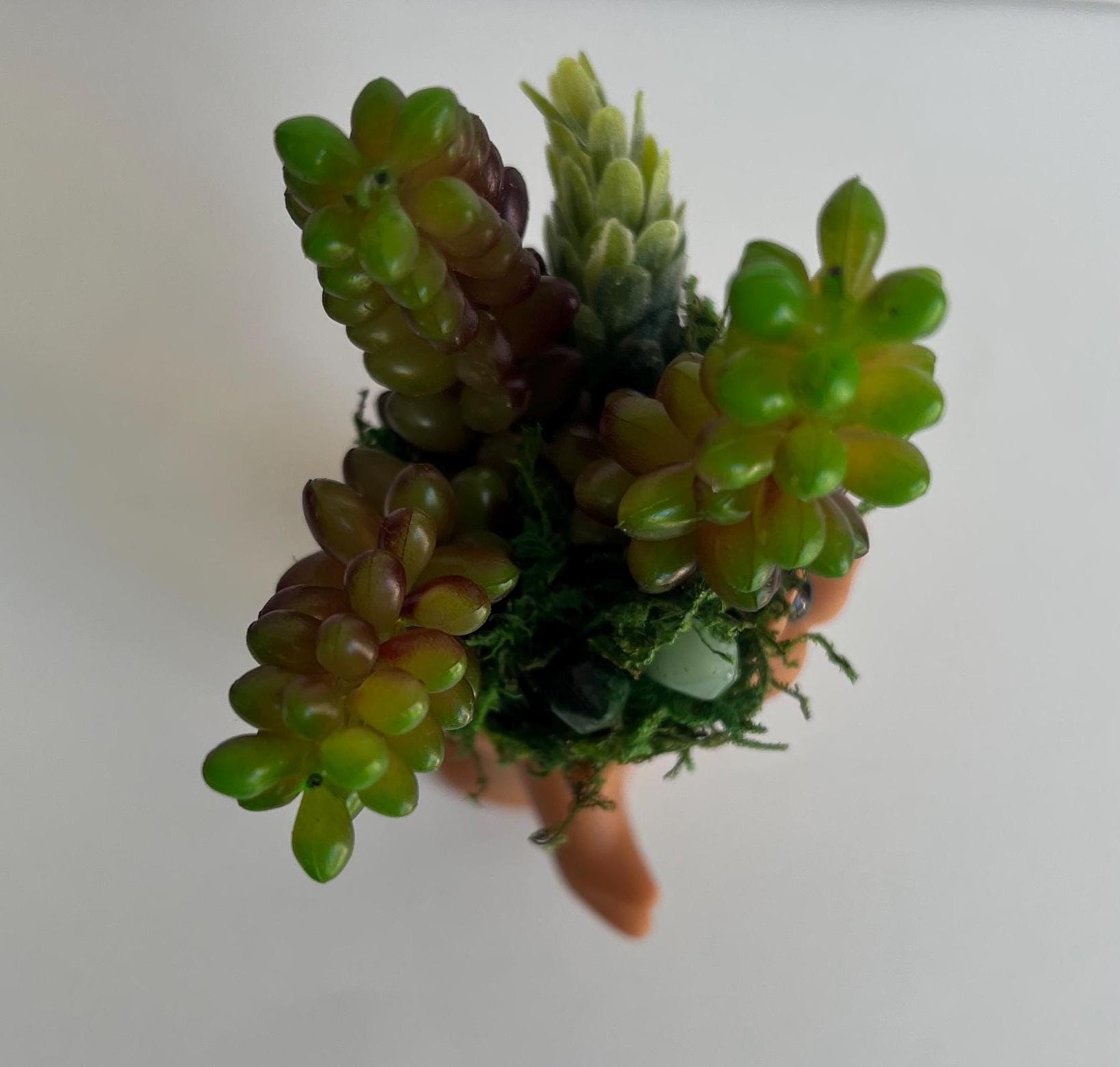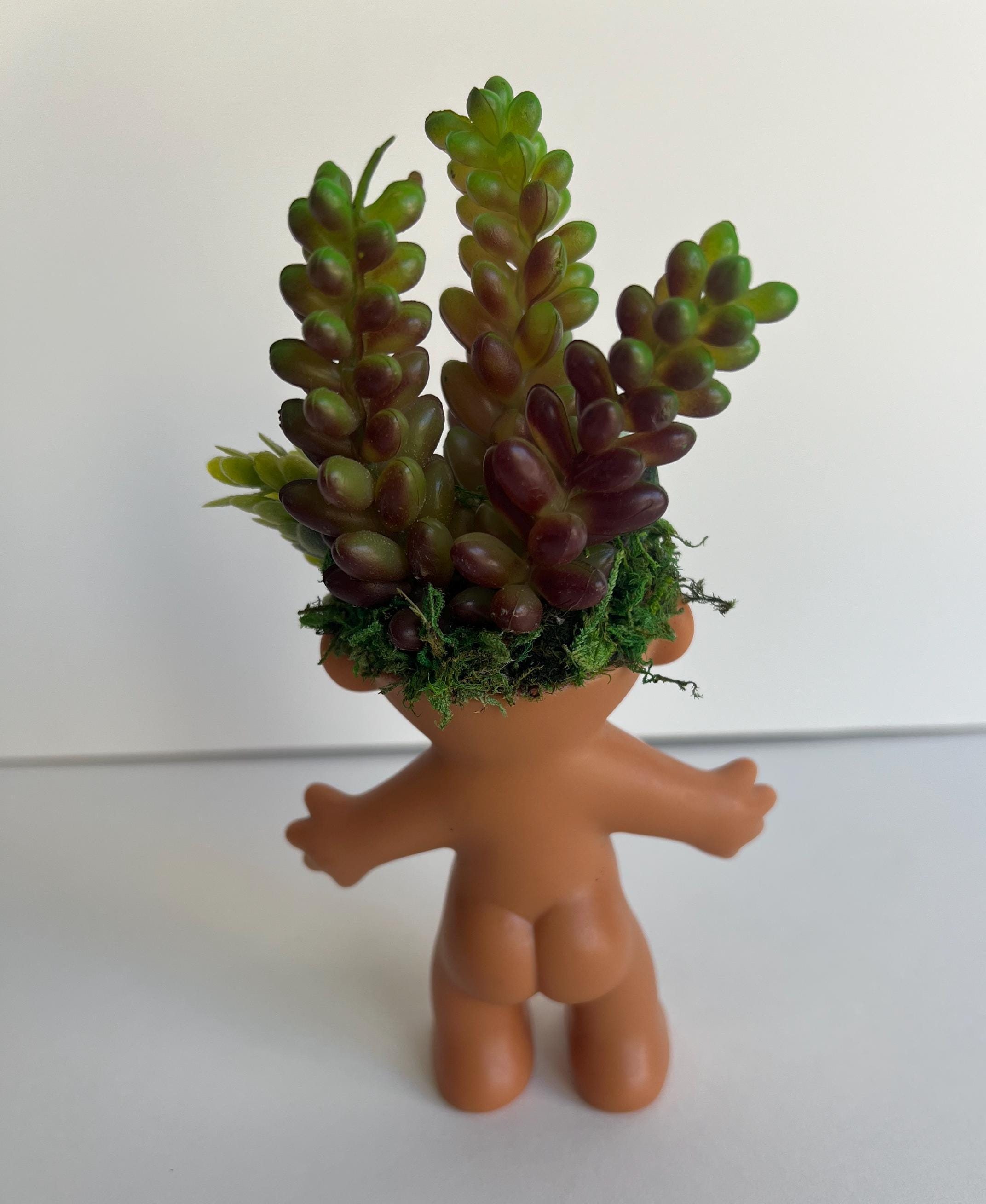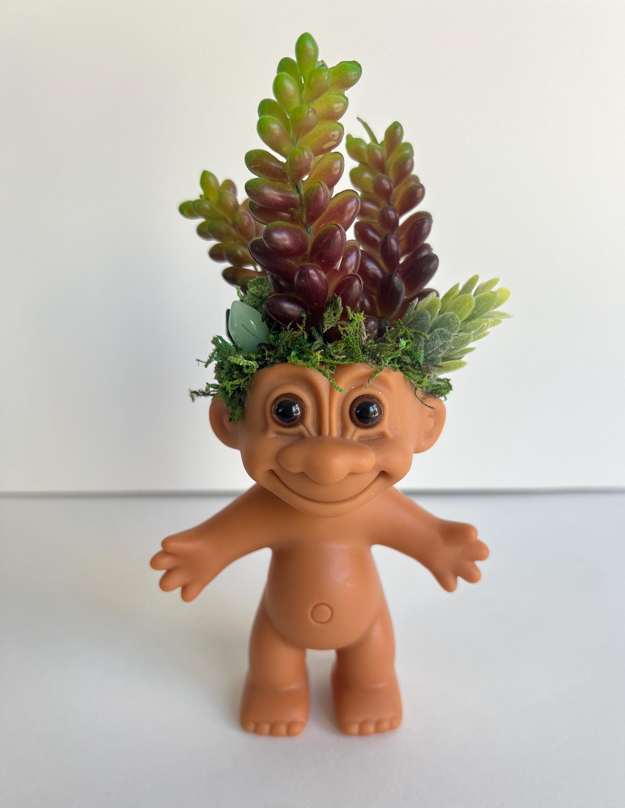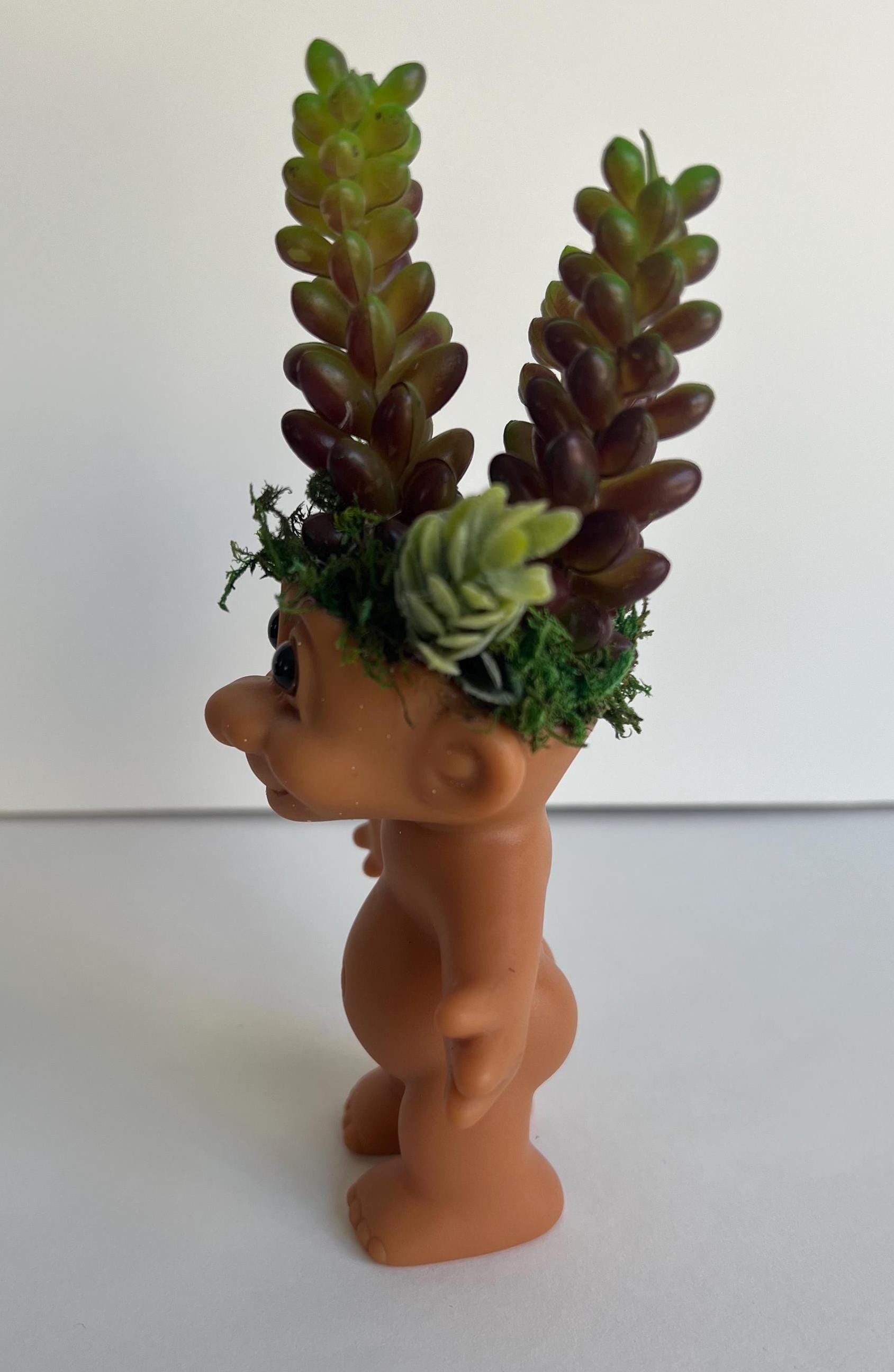 Vintage Russ Brand Troll with brown eyes features faux succulents, moss and gemstone hexagonal small wands. Bohemian vibes give this lucky troll a modern flair. For display purposes only, not a toy. Stands 6" tall at top of succulent and 3.5" wide at fingertips. Vintage troll make have scuffs, tiny white paint spots or other aging as shown in photos.