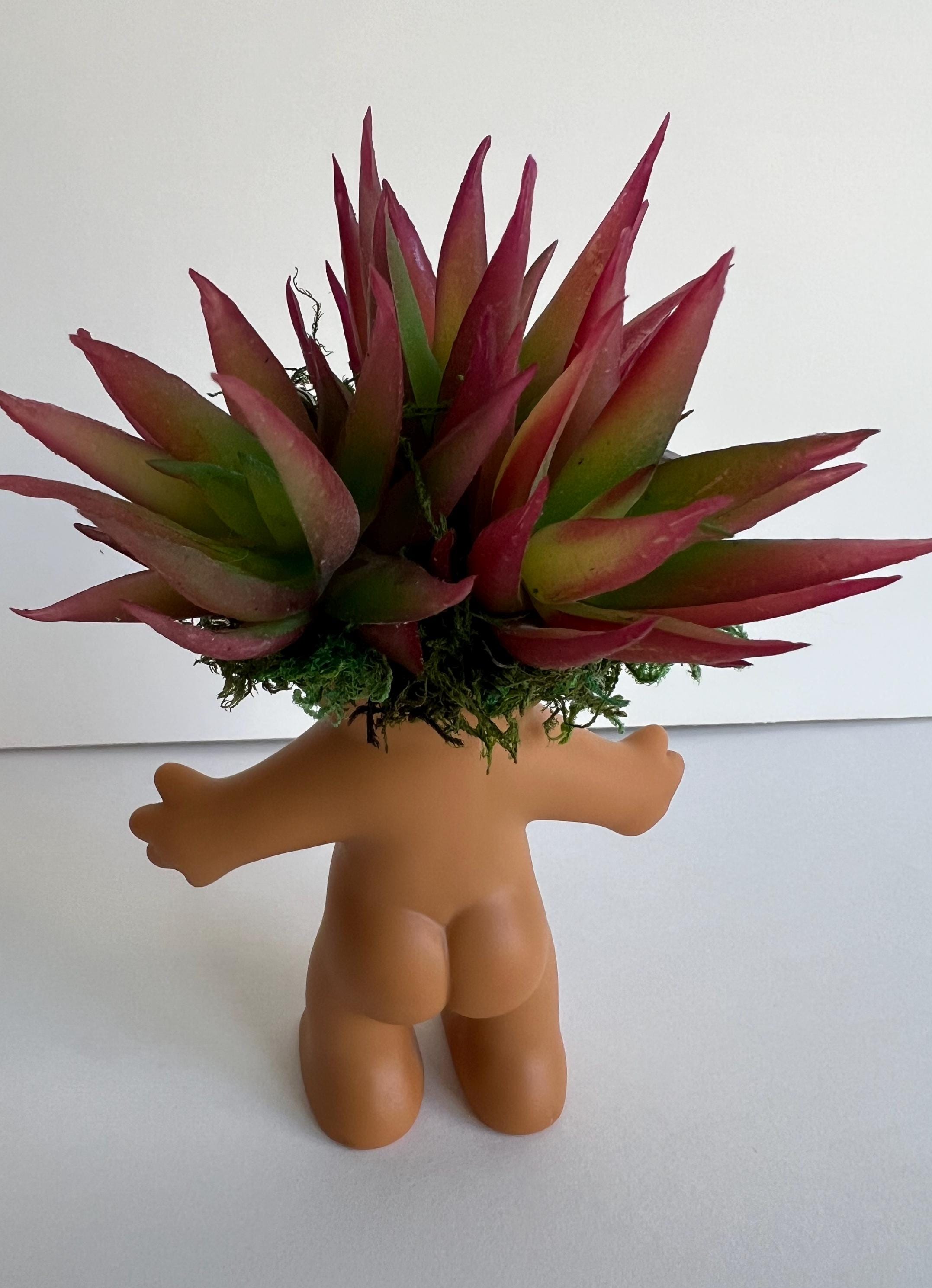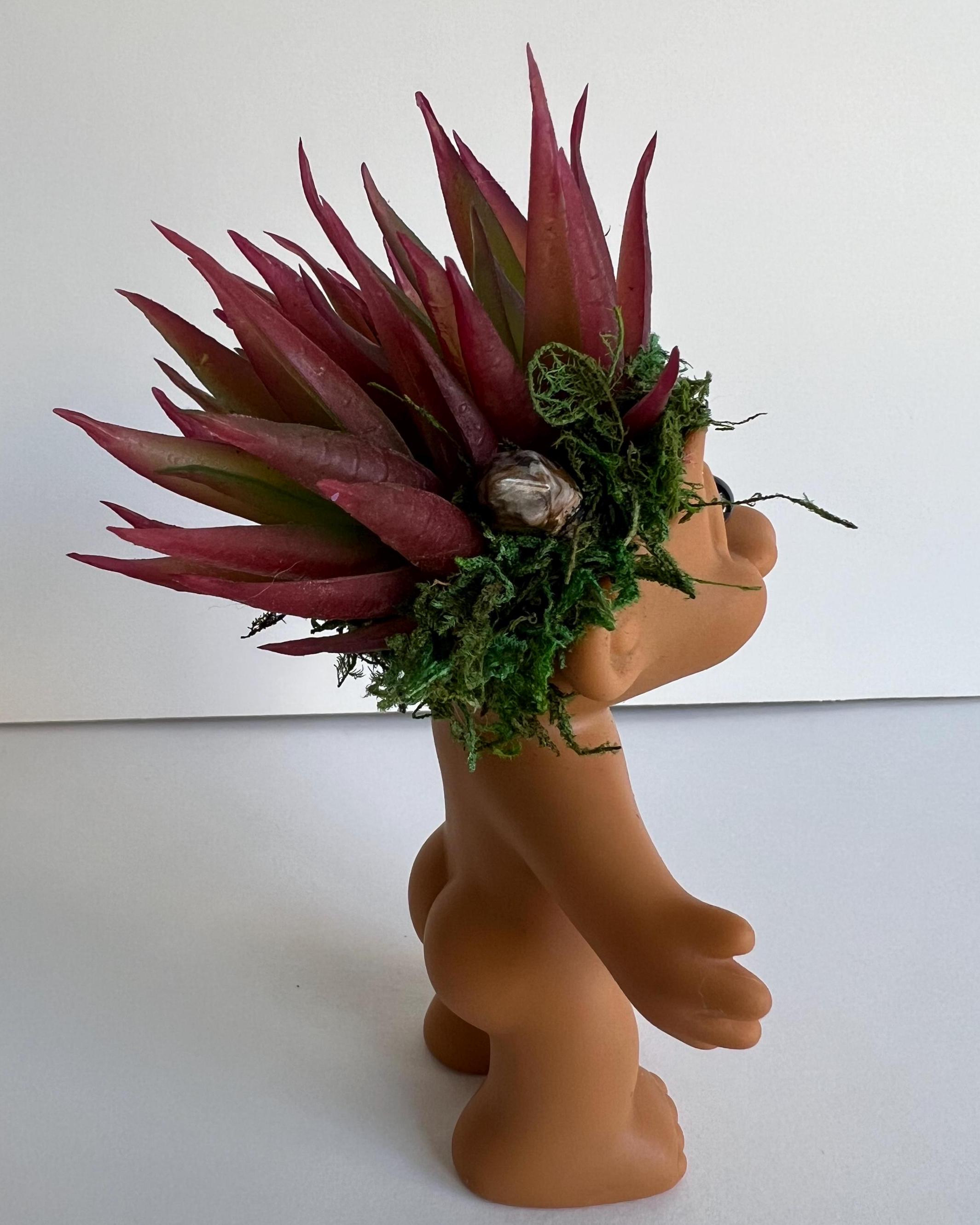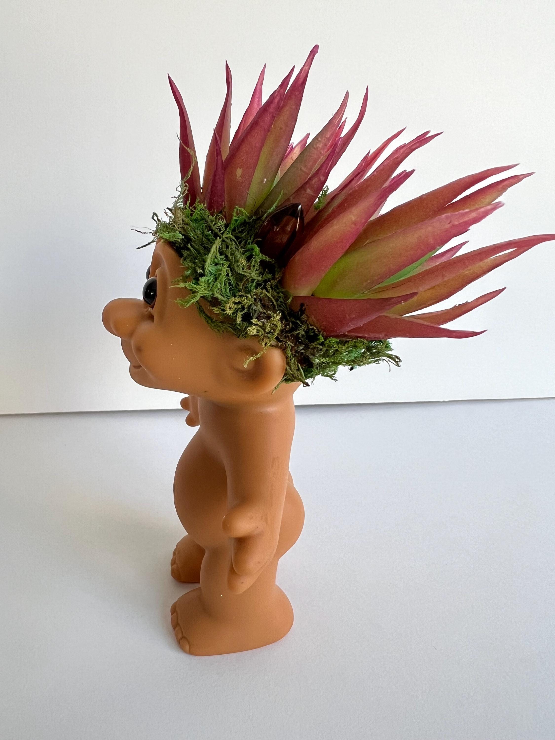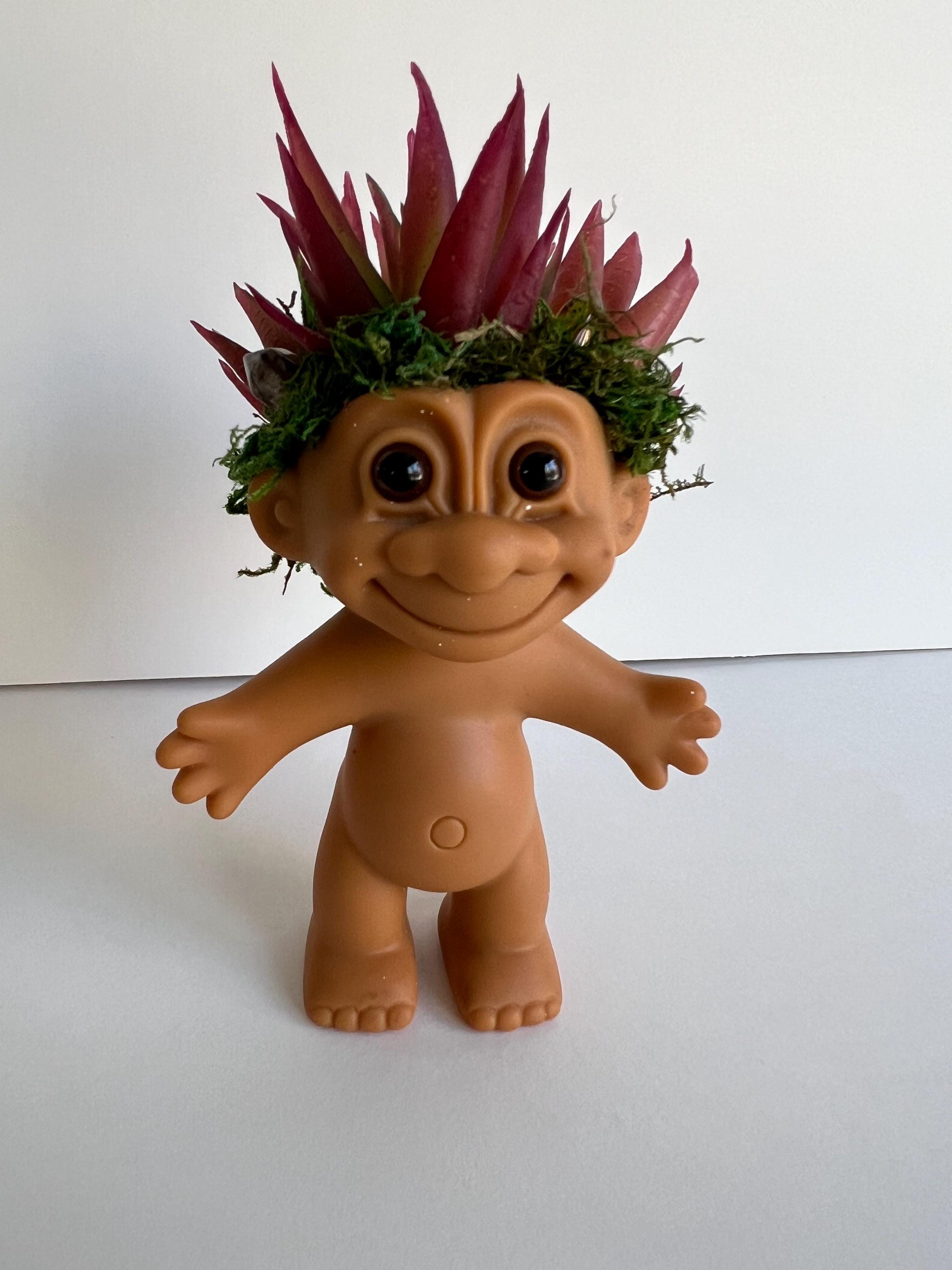 Vintage Russ Brand Troll with brown eyes features faux succulents, moss and gemstone hexagonal small wands. Bohemian vibes give this lucky troll a modern flair. For display purposes only, not a toy. Stands 5.75" tall at top of succulent and 3.5" wide at fingertips. Vintage troll make have scuffs, tiny white paint spots or other aging as shown in photos.